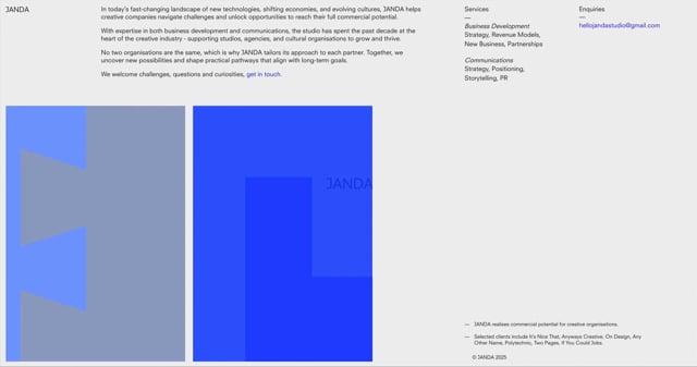 Small business consultancy, JANDA, needed a digital home to communicate its services to potential clients. With a visual identity and initial wireframes created by graphic design studio, Polytechnic, the single-page site was built collaboratively, adding energy and motion while staying true to JANDA's branding.